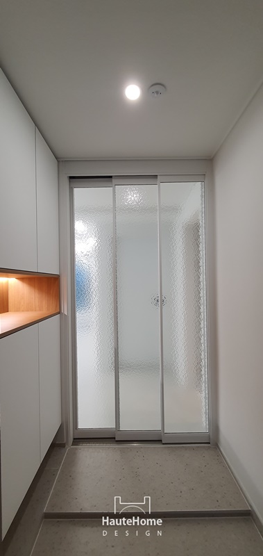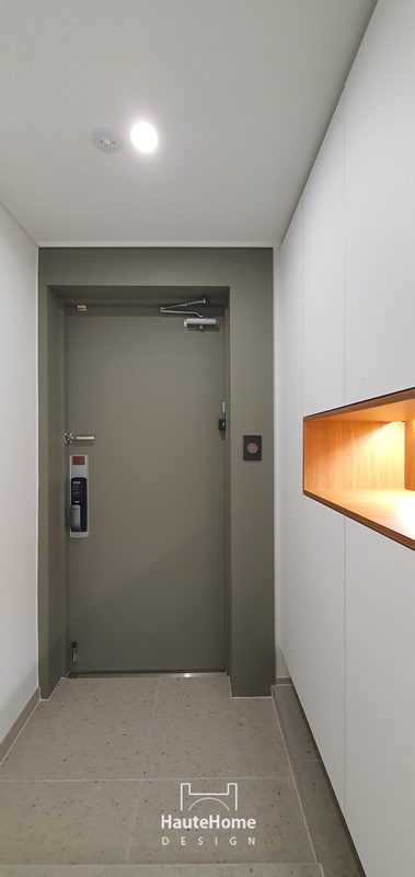 우드 오픈 박스가 있는 신발장과 새롭게 설치한 일괄 소등 스위치