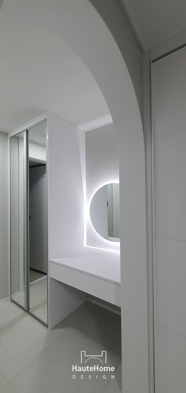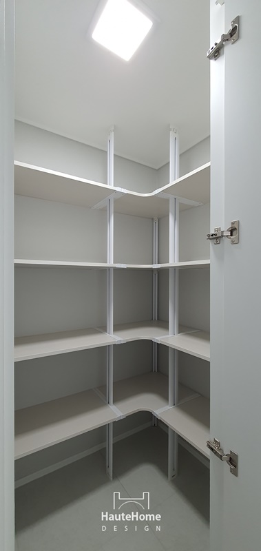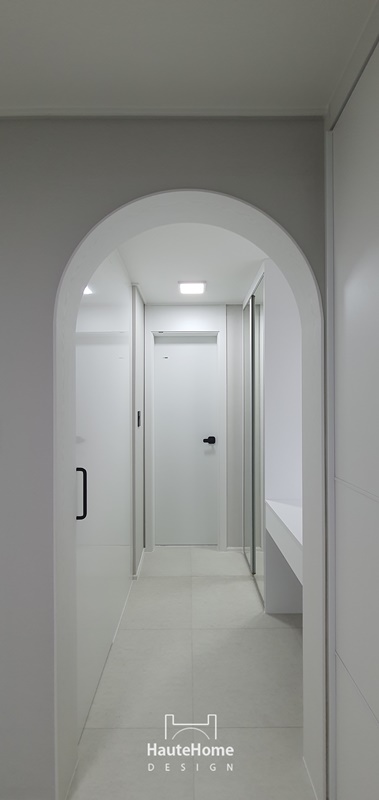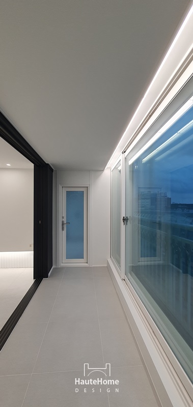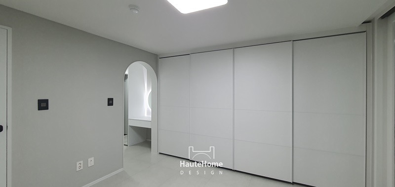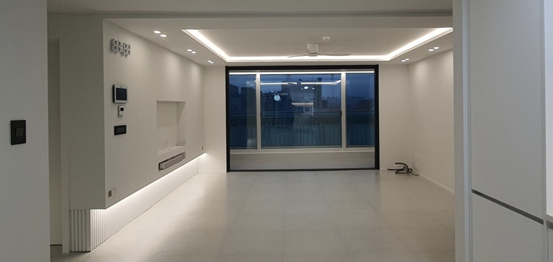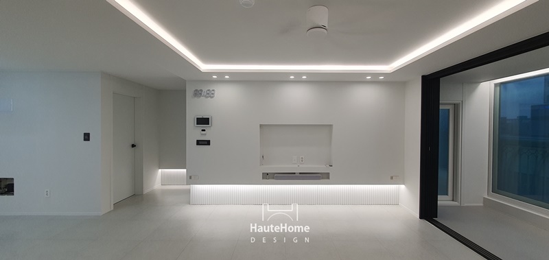 화이트 템바보드와 간접조명, 르그랑 스위치, 매입 TV 구조로 세련되게 완성된 거실