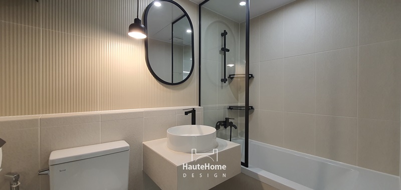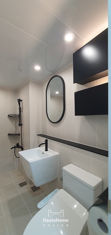 블랙 컨셉의 펜던트와 거울, 파티션, 수전류로 이루어진 최애 욕실