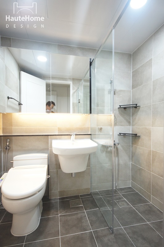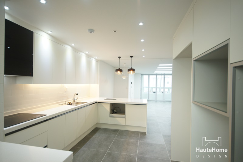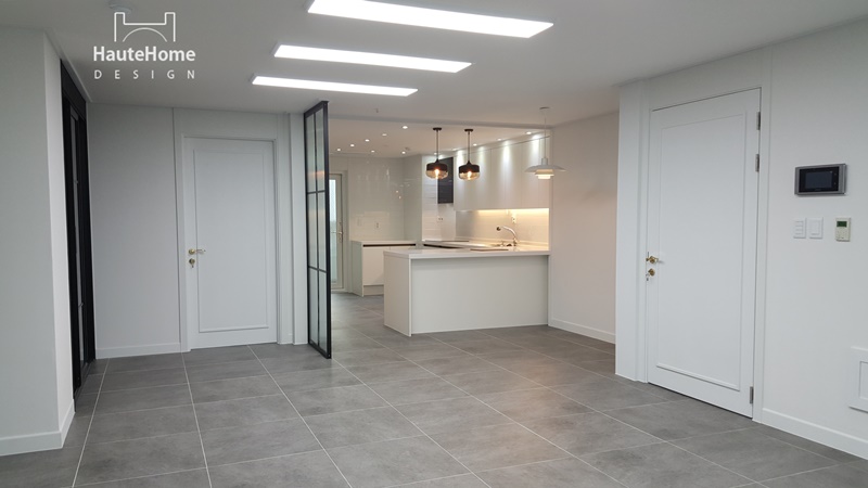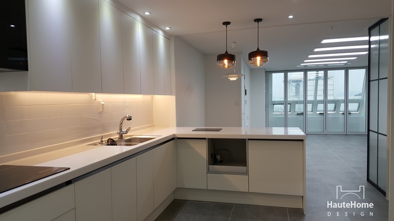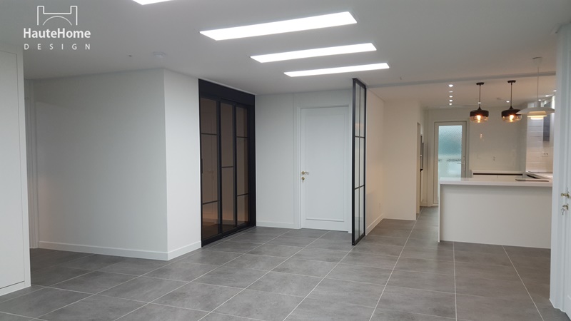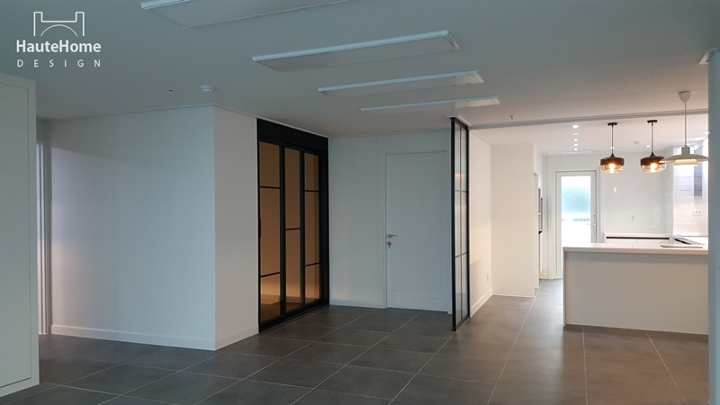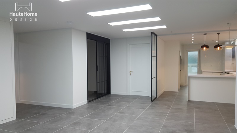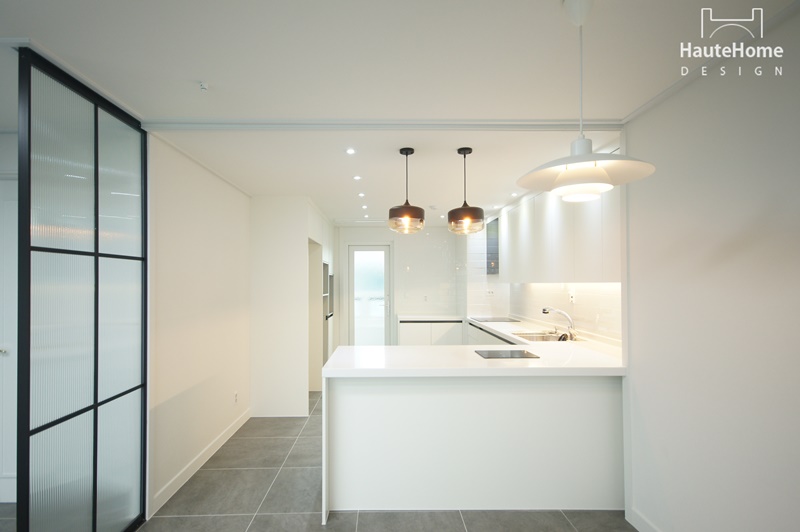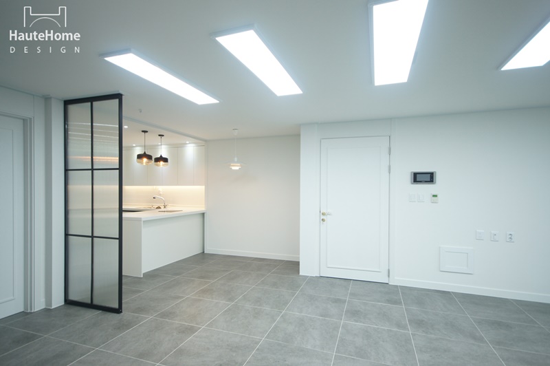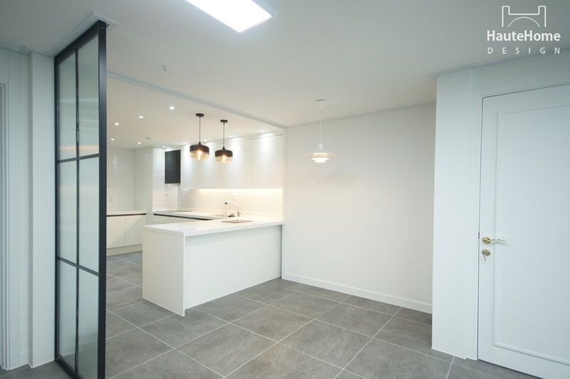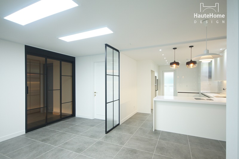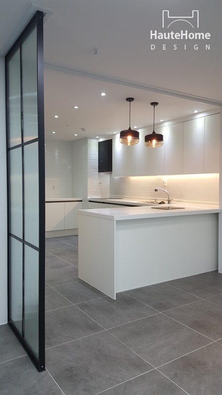 집안에 들어서면 바로 보이던 주방을 세련된 유리 파티션으로 커버하였고